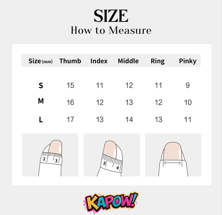 Hold a measuring tape horizontally to measure the widest curvature of your nail bed. Record the sizes.