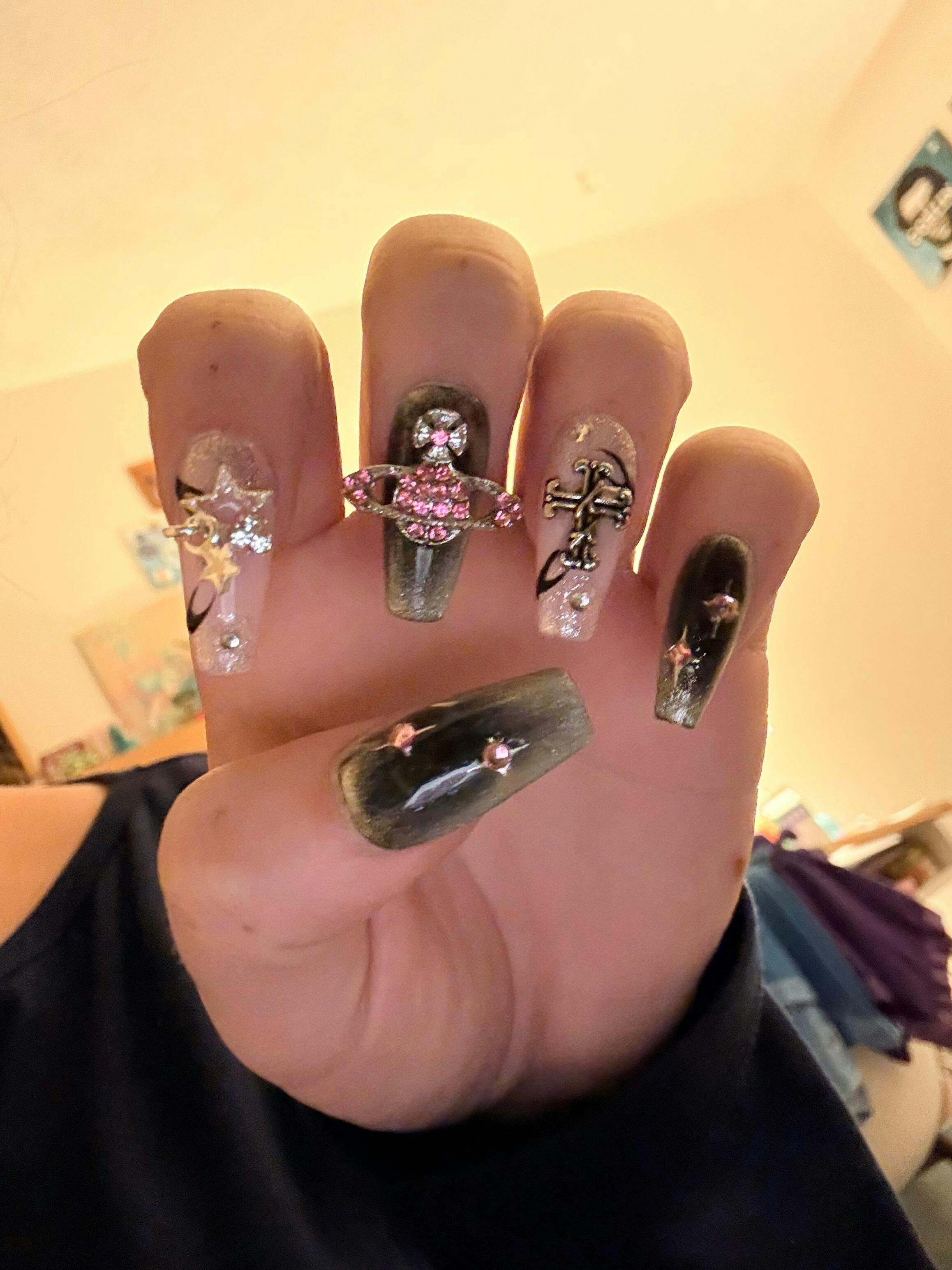 Coffin Medium Nails Black Pink Star Butterfly Glitter