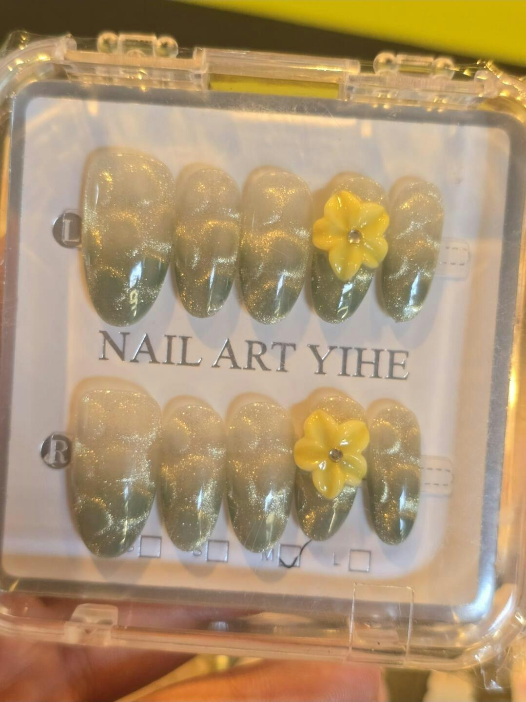KAPOWNAILS Cat-Eye Press-On Nails – Green to Nude Gradient with Gold Glitter & 3D Floral Accents