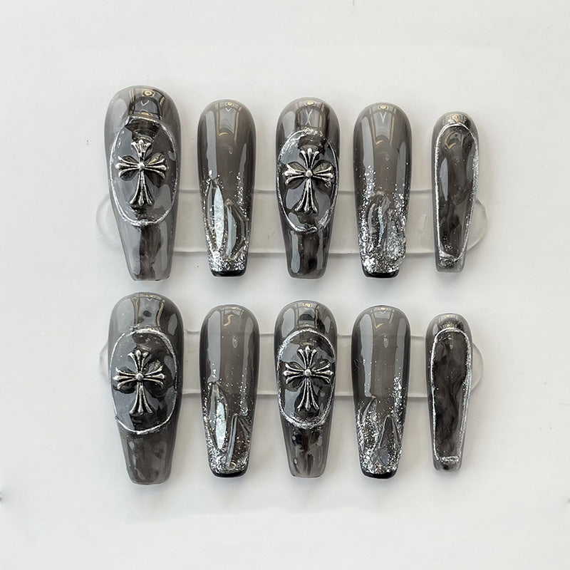 Dark Grey Press on with Silver Cross, Edgy Gothic Nail Design