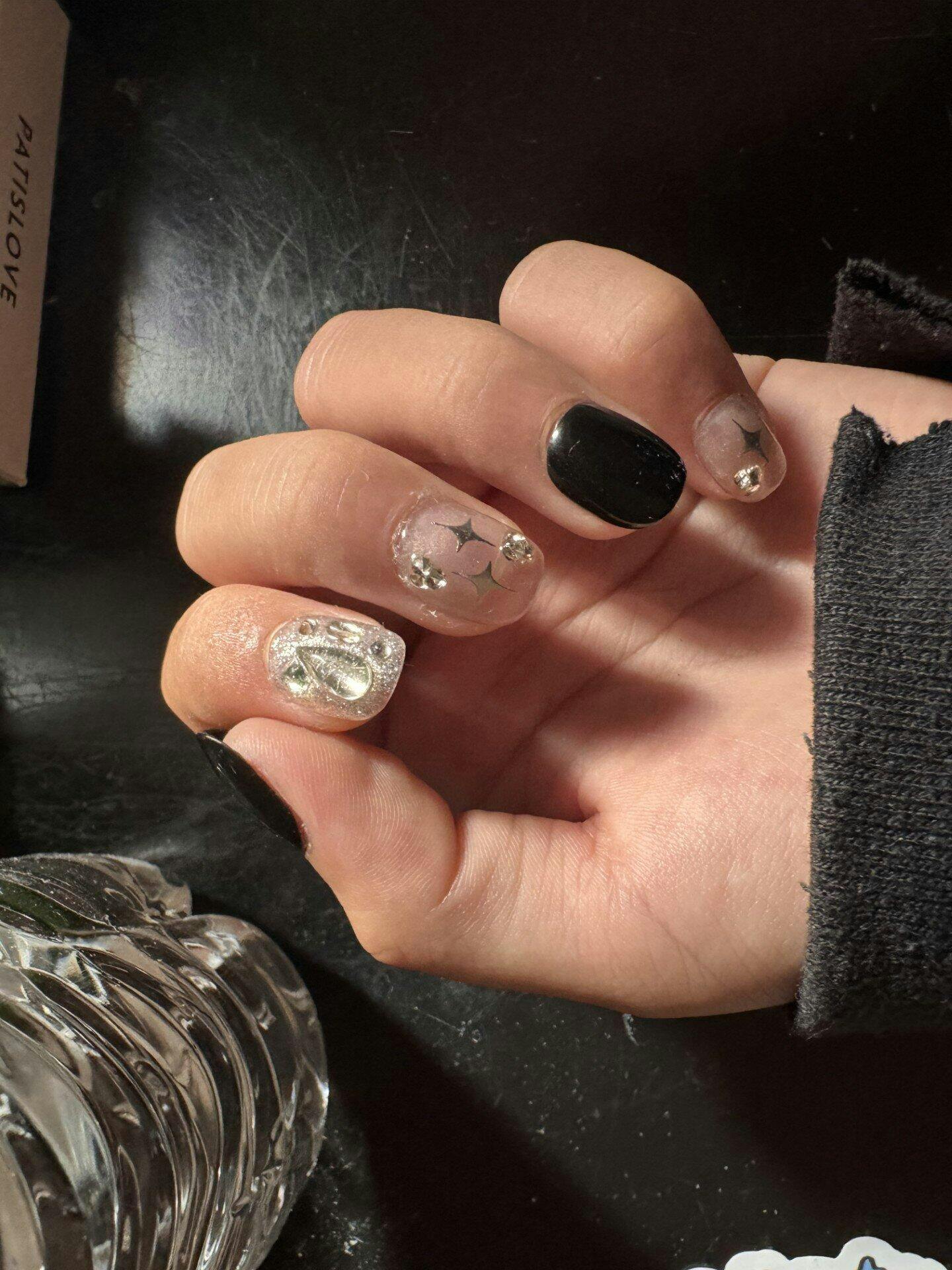 - Black Clear Color Scheme: Classic monochrome base with transparent accent nails