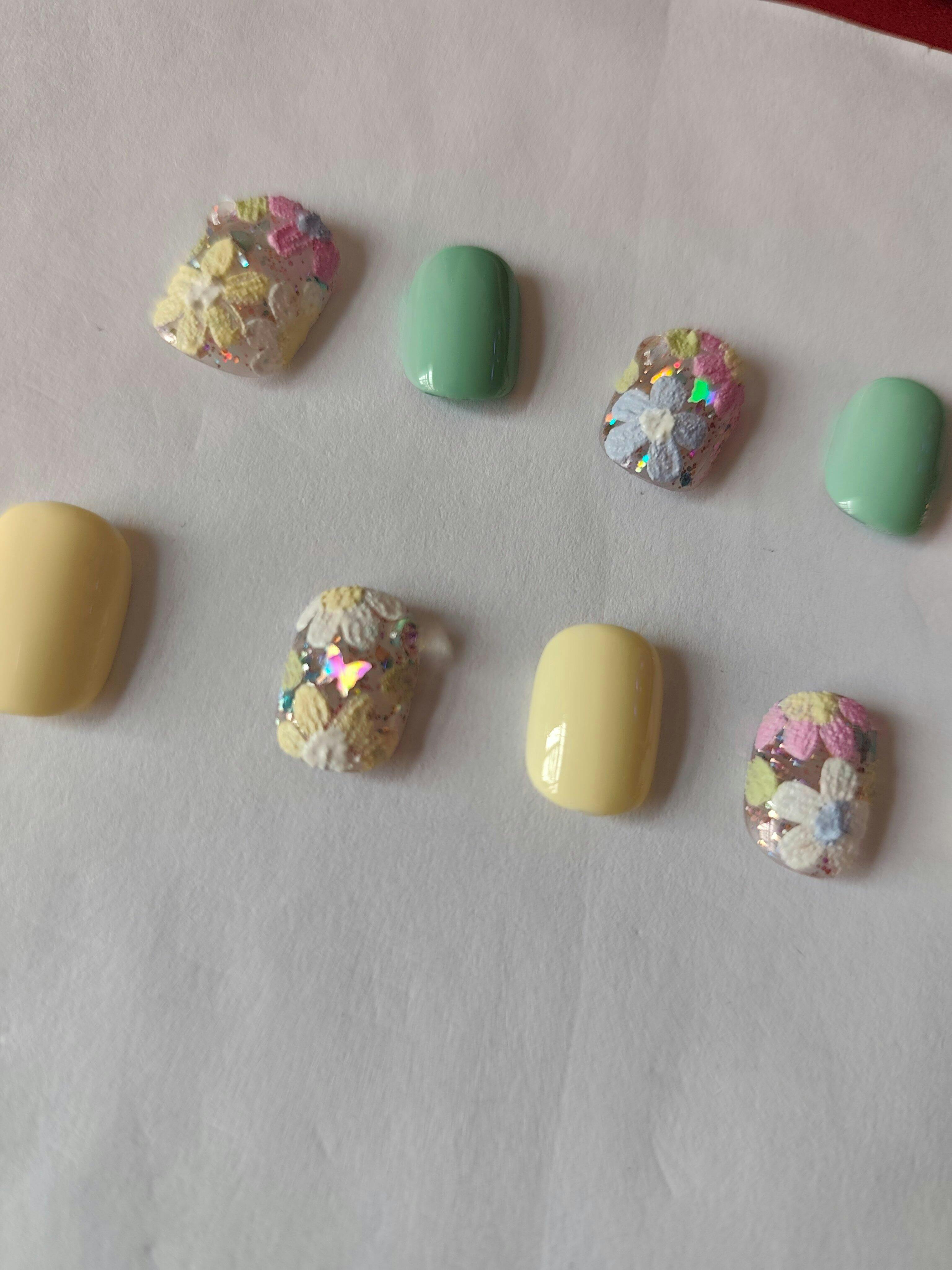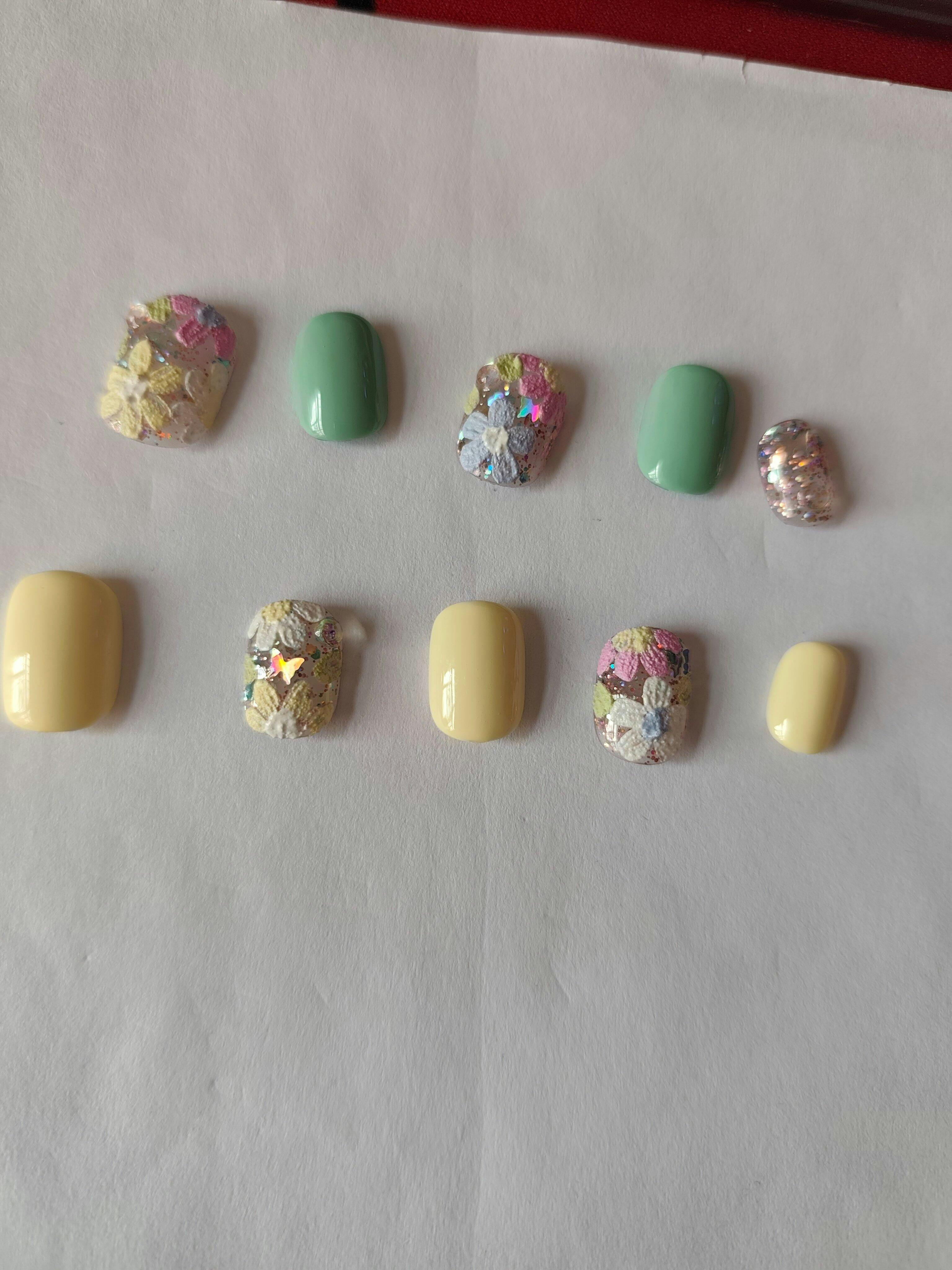 Squoval Short Nails Mint Green Yellow Floral Crystal Mix